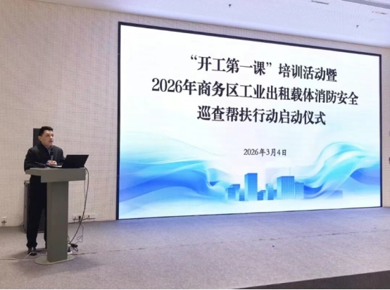 在觀看專題授課直播當天,商務區舉辦2026年工業出租載體消防安全巡查幫扶行動啟動儀式并作專題部署,強調巡查幫扶行動要從載體實際情況出發,幫助載體構建“產權方全面負責、物業方統一管理、承租方具體落實”的責任體系,協助排查電動自行車、委外作業、危險化學品等重點領域火災風險隱患,指導做好隱患整改、教育培訓、應急演練等工作。