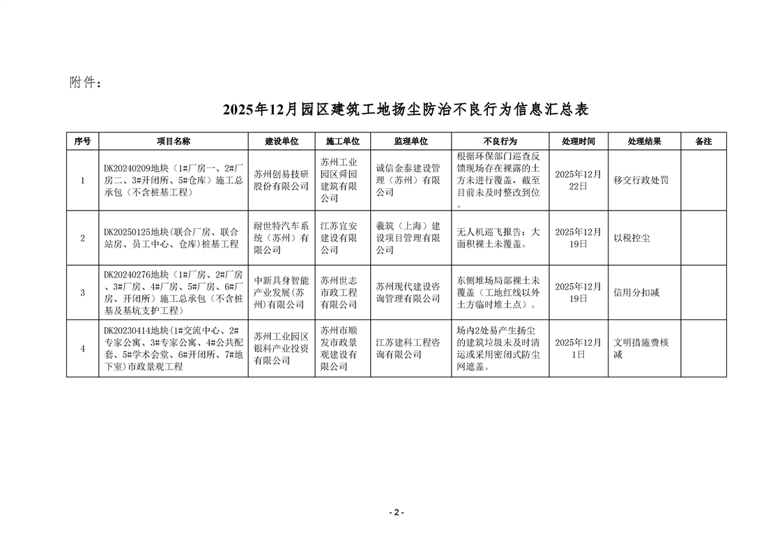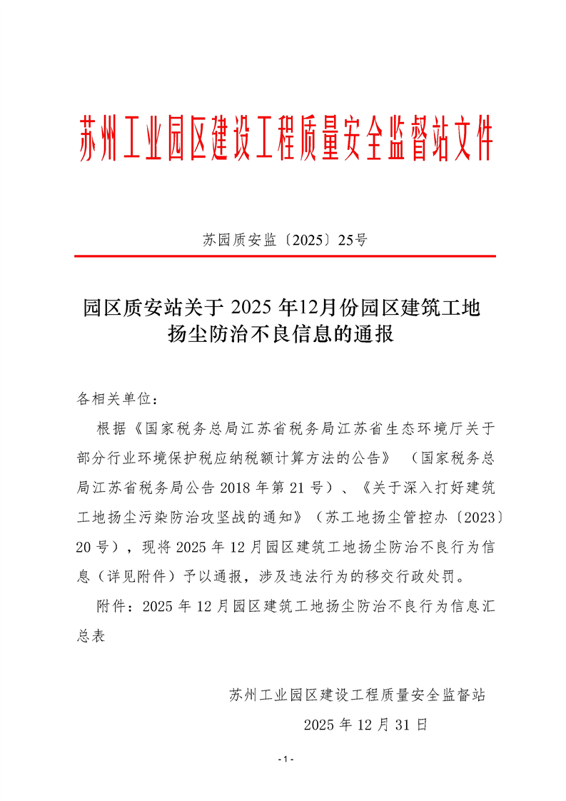 園區(qū)質(zhì)安站關(guān)于2025年12月份園區(qū)建筑工地?fù)P塵防治不良信息的通報