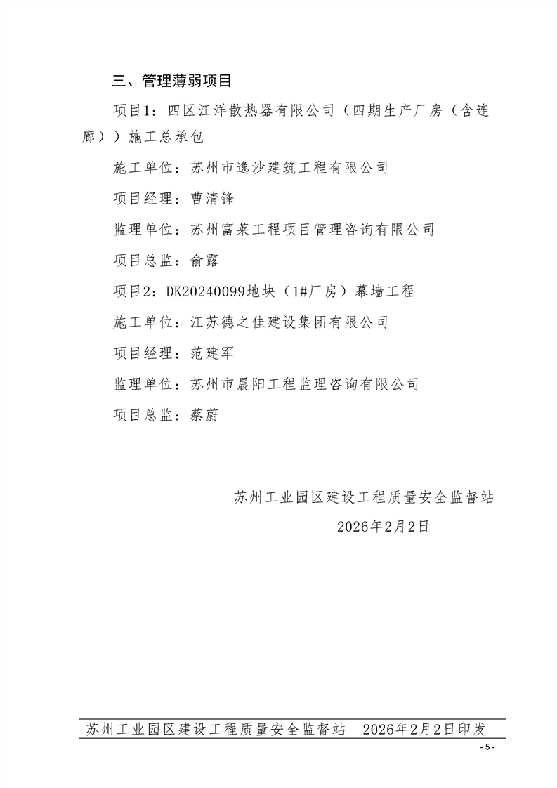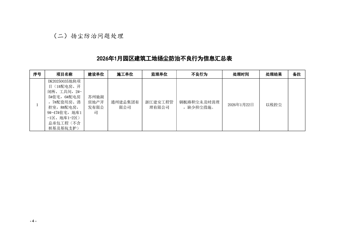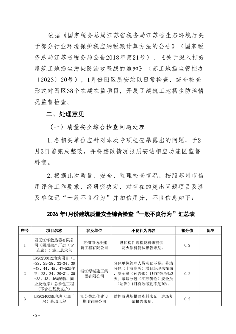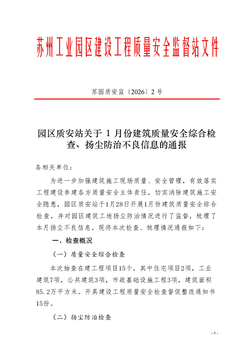 園區質安站關于1月份建筑質量安全綜合檢查、揚塵防治不良信息的通報