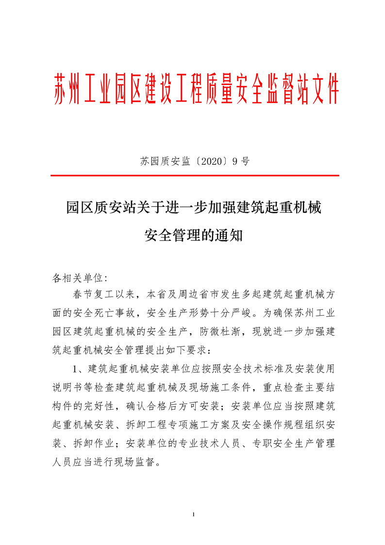 園區(qū)質(zhì)安站關(guān)于進一步加強建筑起重機械安全管理的通知