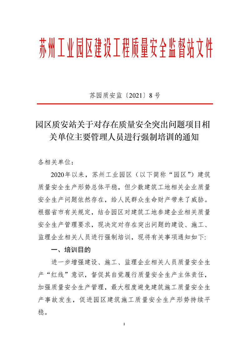 園區質安站關于對存在質量安全突出問題項目相關單位主要管理人員進行強制培訓的通知