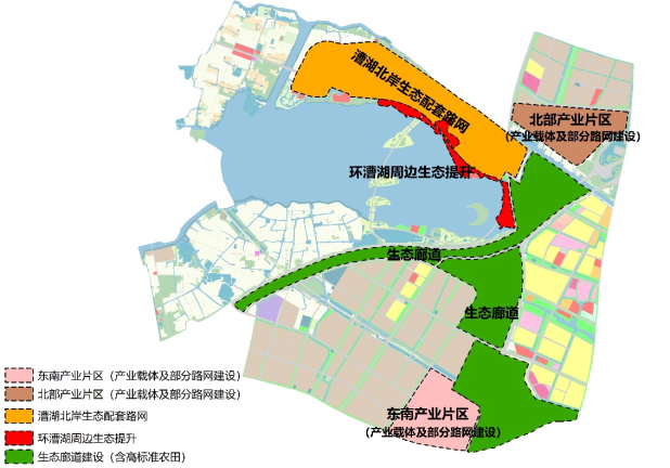 漕湖沿岸生態(tài)環(huán)境提升及產(chǎn)業(yè)升級項目主要建設(shè)內(nèi)容包括生態(tài)提升、基礎(chǔ)設(shè)施、水系治理、產(chǎn)業(yè)載體及商業(yè)配套。