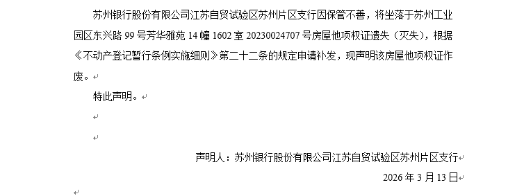 關于蘇州工業園區東興路99號芳華雅苑14幢1602室20230024707號房屋他項權證遺失聲明