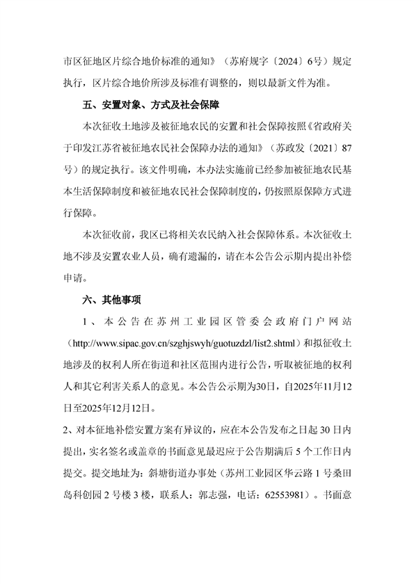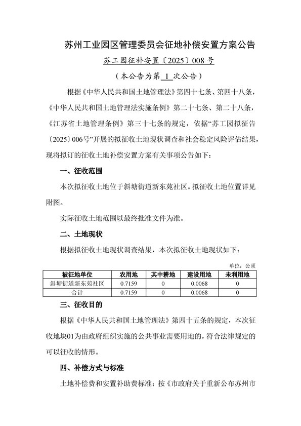 蘇州工業園區管理委員會征地補償安置方案公告(蘇工園征補安置〔2025〕008號)