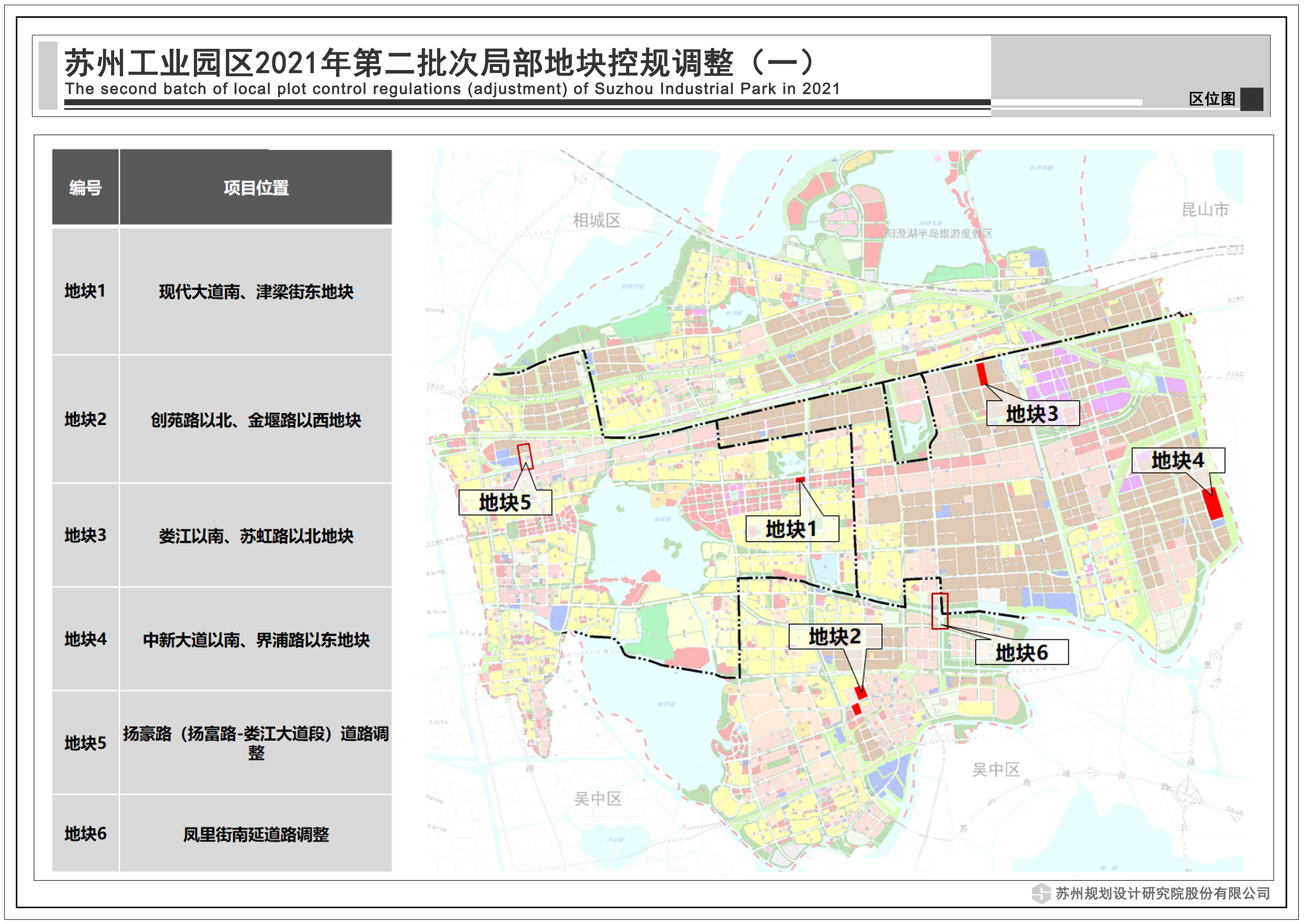 蘇州工業園區2021年第二批次局部地塊控規調整(一):共包括6個地塊,總用地面積0.64平方公里,詳見附圖區位圖。