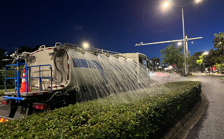 面對高溫干旱,傳統(tǒng)澆水方式疲于應對大規(guī)模綠化養(yǎng)護的需求。為此,園區(qū)市政服務集團指導生產企業(yè),共同研發(fā)新型智能水車,其獨特設計的多向可調噴頭及前后水炮,通過駕駛室智能控制系統(tǒng)實現(xiàn)精準灌溉,既節(jié)省了人力成本,又大幅提升了澆水質量與效率。這一創(chuàng)新技術的應用,為園區(qū)綠化帶來了及時而充足的“甘霖”,確保了每一株植物都能得到充分的滋養(yǎng)。