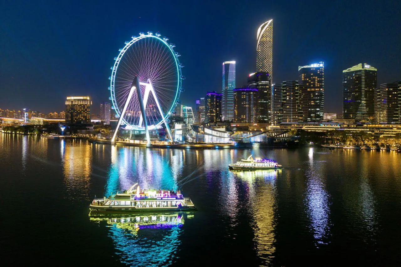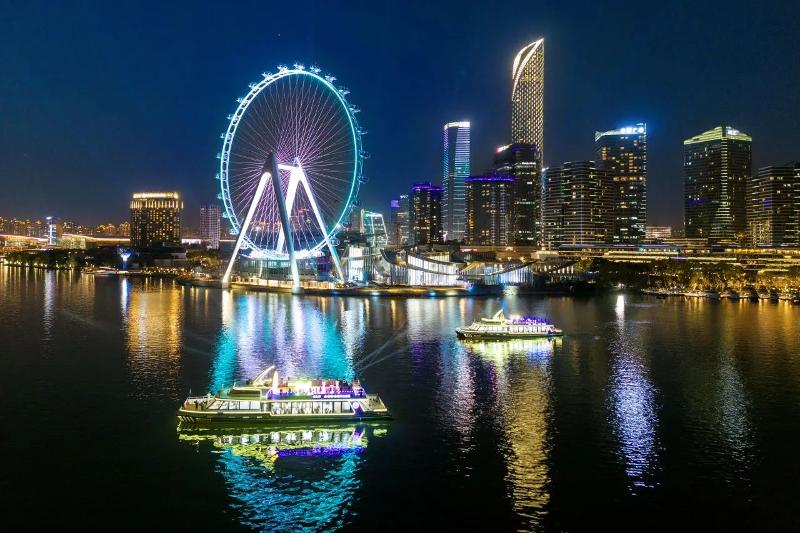 如果說“蘇州之眼”是天空的詩篇,那么右岸新航線就是水面的畫卷。夜幕降臨,“蘇州之眼”摩天輪星光閃耀,金雞湖雙體新游船霓虹流轉,水岸光影交相輝映,為園區(qū)這座現(xiàn)代化新城更添了幾分夢幻與浪漫色彩,令人流連忘返。