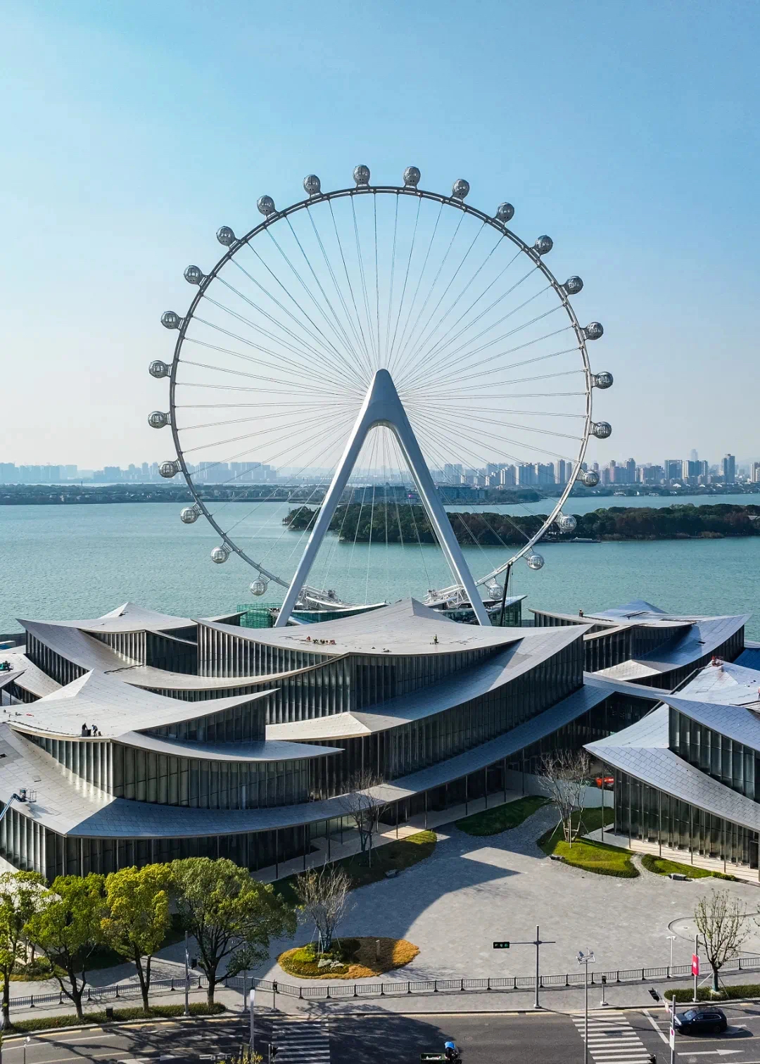 據(jù)介紹,“蘇州之眼”的設計靈感源于江南水鄉(xiāng)的柔美與蘇州園林的意境。通過異型雙立柱輪輻式結構及回轉式太空艙,既保留了傳統(tǒng)水鄉(xiāng)的婉約氣質,又以科技感造型融入現(xiàn)代CBD天際線。摩天輪底部建筑運用“折紙藝術”,采用折扇形屋頂及大面積落地玻璃設計,打造“濱水而居”的獨特空間體驗。