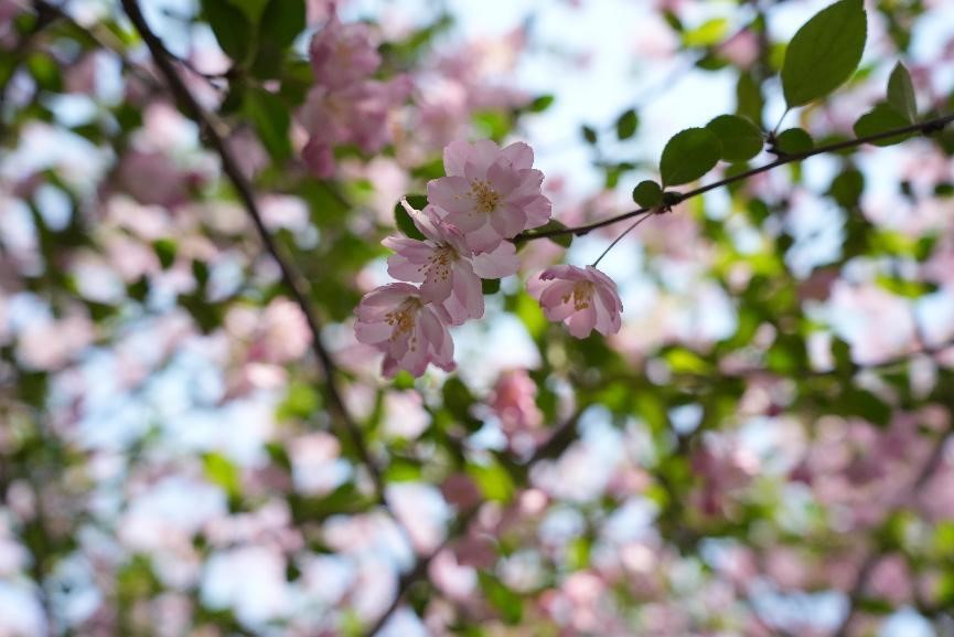 海棠花朵朵盛放時,枝條被花朵壓得微微低垂,形成了一片粉紅色的花海,宛如粉色的云霞,陽光透過花瓣灑下,光影斑駁,形成了一幅幅絕美的畫面。