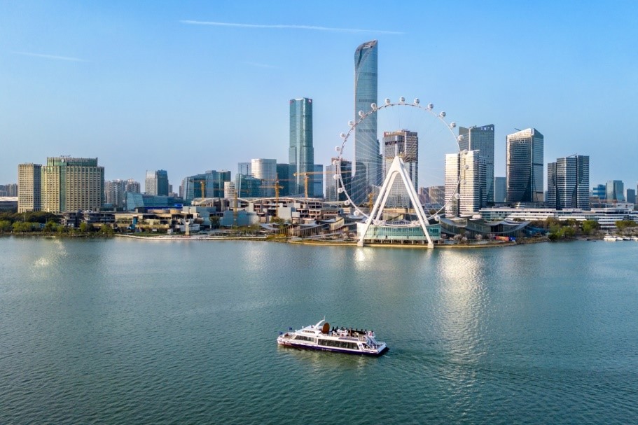 今年,伴隨著“蘇州之眼”的驚艷亮相,由新時(shí)代集團(tuán)精心打造的“金雞湖號(hào)”雙體游船與右岸新航線也華麗登場(chǎng)。