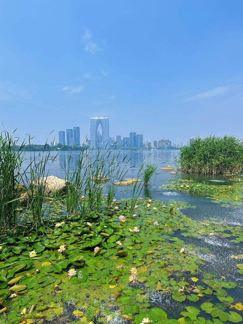 初夏時節,微風輕拂,環金雞湖步道蘇州文化藝術中心段,一朵朵睡蓮在晨光中蘇醒,正悠然綻放,將湖面裝點成一幅靈動的生態畫卷。