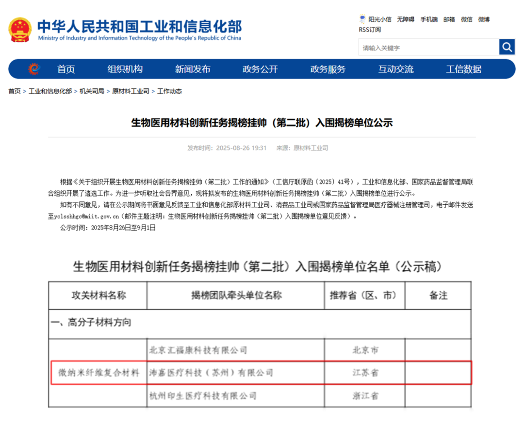 2025年8月,沛嘉醫療與聯合體成員單位等共同申報的“用于心臟瓣膜的超高分子量聚乙烯微納米纖維仿生復合材料研發及應用”項目,成功入選由工業和信息化部、國家藥品監督管理局聯合發布的生物醫用材料創新任務揭榜掛帥(第二批)入圍單位名單。