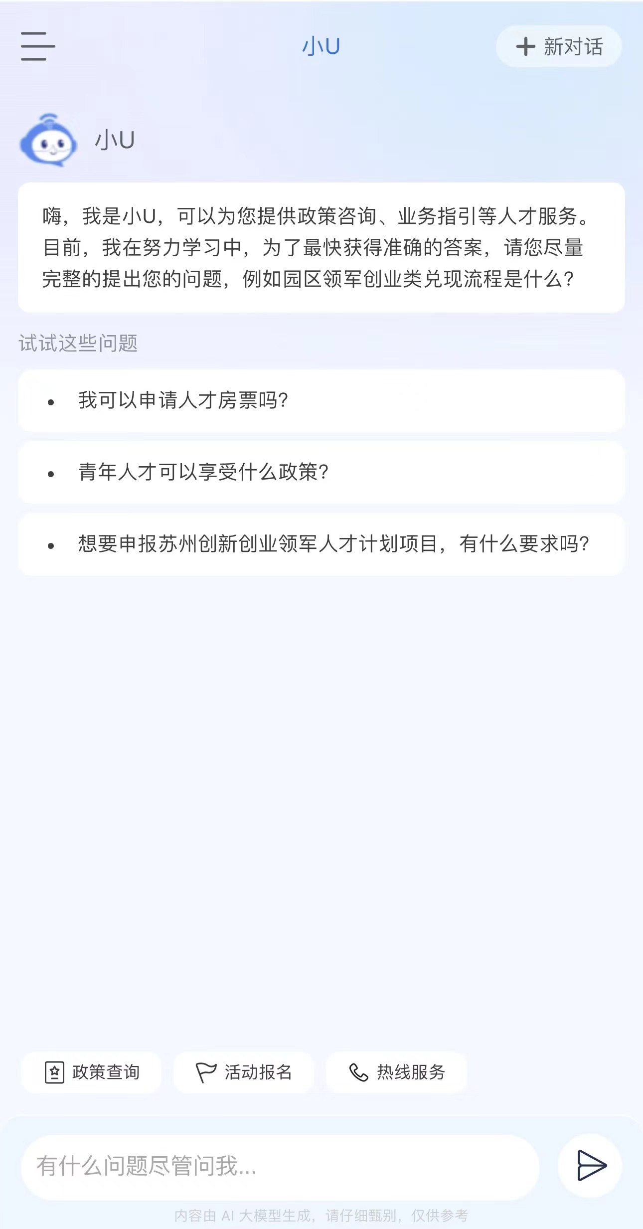 “SIP才無憂”深度聚焦提升人才的使用體驗,通過接入DeepSeek-R1“滿血版”,全新推出首個高智版AI助手“小U”,構建智能化人才服務體系,實現“政策秒配、服務無界”。