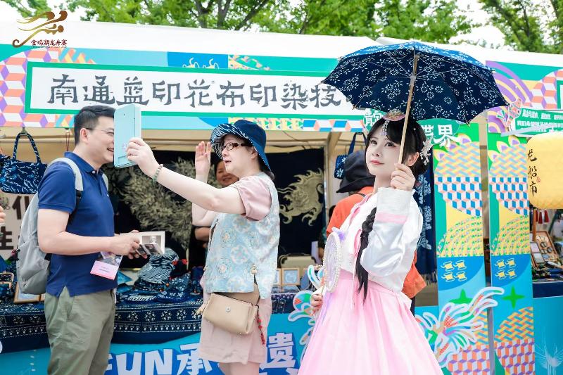 南通藍染、鎮江竹編、阿林老繡、貴州印染、秋和月手作纏花、山澗民族風文創等6項外地非遺及品牌首次參與盛會。南通藍染技藝市級傳承人曹春燕一邊耐心地向大家展示藍染制品,一邊興奮地說:“攤位上的藍染制品都是純手工制作,這次我們是第一次到金雞湖龍船市擺攤,好多小朋友都對藍印花布的制作工藝很感興趣,我們都一一介紹,這個平臺真是太棒了,給了這項古老技藝一個絕佳的推廣展示機會,讓更多人了解藍染、愛上藍染。”