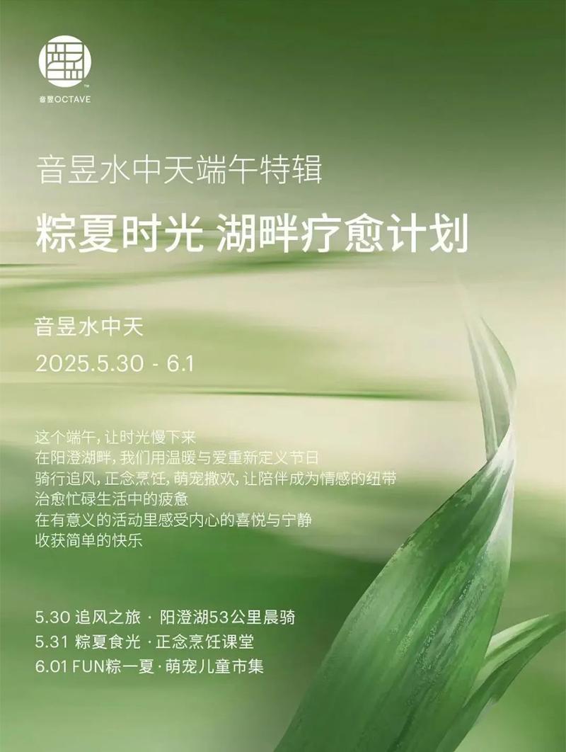 音昱水中天推出端午特輯“粽夏時光 湖畔療愈計劃”,邀你在陽澄湖畔騎行追風(fēng)、正念烹飪、萌寵撒歡,讓時光慢下來,讓陪伴成為情感的紐帶,在有意義的活動里感受內(nèi)心的喜悅與寧靜,收獲簡單的快樂。