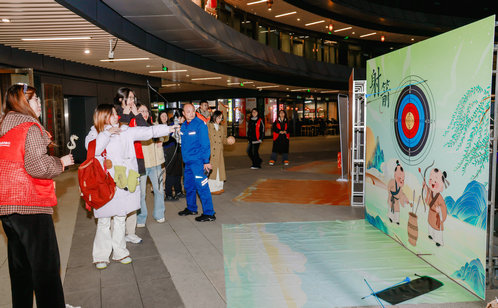 作為市集“集券核心打卡點(diǎn)”,古風(fēng)運(yùn)動(dòng)區(qū)的蹴鞠、射箭、投壺三大項(xiàng)目一經(jīng)開放就人氣拉滿。活動(dòng)以游園券作為通用兌換憑證,完成運(yùn)動(dòng)項(xiàng)目即可獲取,趣味與挑戰(zhàn)性拉滿?,F(xiàn)場,紅色管家志愿者全程在線指導(dǎo)規(guī)則、示范動(dòng)作,青年情侶、好友組隊(duì)摩拳擦掌踴躍參戰(zhàn)。蹴鞠場地里,大家瞄準(zhǔn)目標(biāo)全力開踢,命中瞬間的歡呼聲此起彼伏;射箭區(qū)域內(nèi),年輕人踮腳拉弓、精準(zhǔn)瞄準(zhǔn)靶心,專注模樣收獲一眾點(diǎn)贊;投壺項(xiàng)目前,參與者屏息凝神投放箭矢,每中一支都忍不住歡呼喝彩。不少青年組隊(duì)PK挑戰(zhàn),在競技互動(dòng)中拉近距離,一張張游園券不僅是實(shí)力的證明,更裝滿了歡樂時(shí)光。