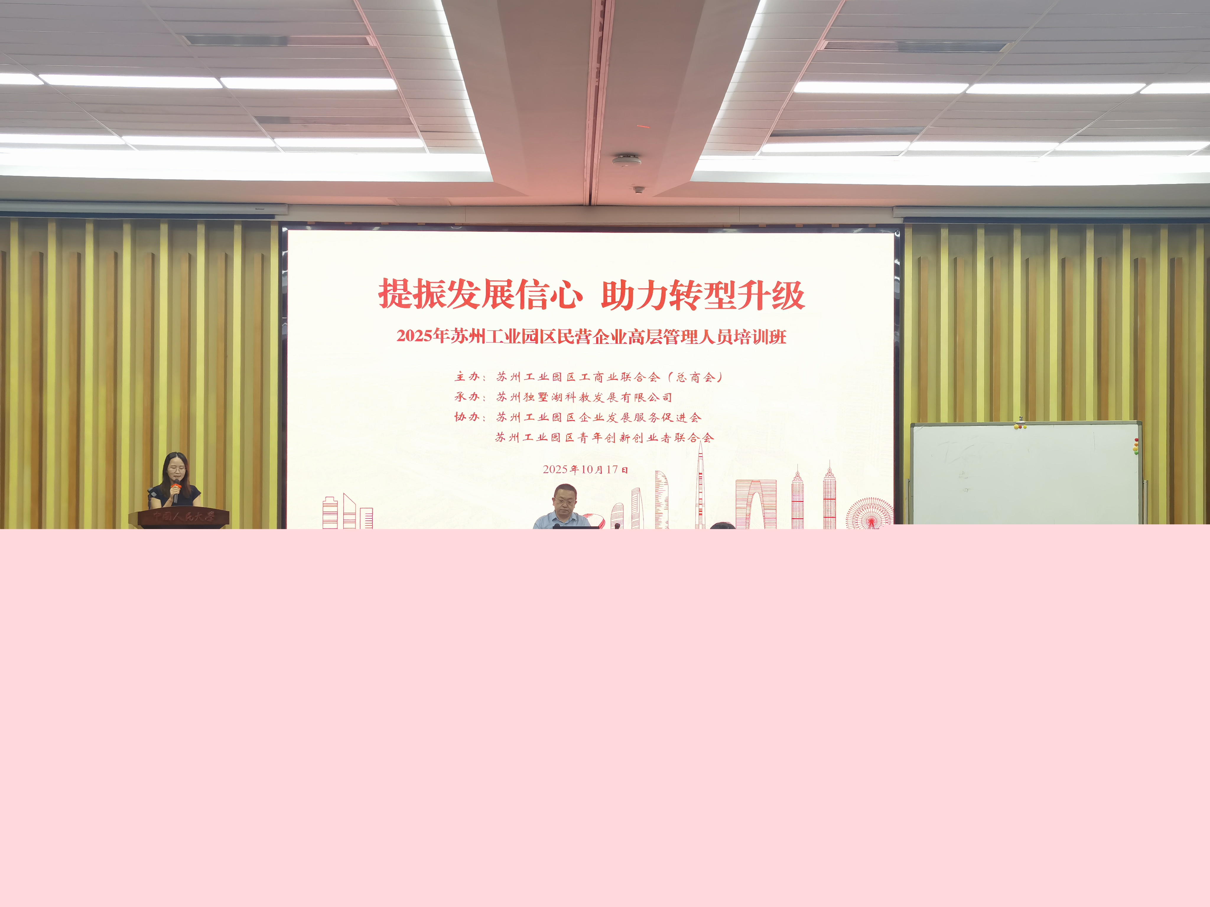 10月16日至17日,2025年蘇州工業園區民營企業高層管理人員培訓班在中國人民大學(蘇州校區)成功舉辦。本次培訓由園區工商聯(總商會)主辦,旨在幫助園區廣大民企負責人開拓視野、認清形勢,準確把握新時代中國穩中求進的大趨勢,不斷提高民企的內生動力。兩天共超過200人次參加培訓。