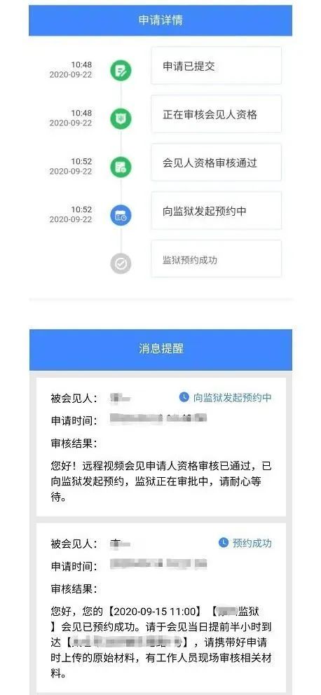 向監(jiān)獄預(yù)約成功后,工作人員會(huì)將會(huì)見(jiàn)時(shí)間、地點(diǎn)及相關(guān)要求通過(guò)“消息提醒”和手機(jī)短信發(fā)送給家屬,請(qǐng)注意查收。