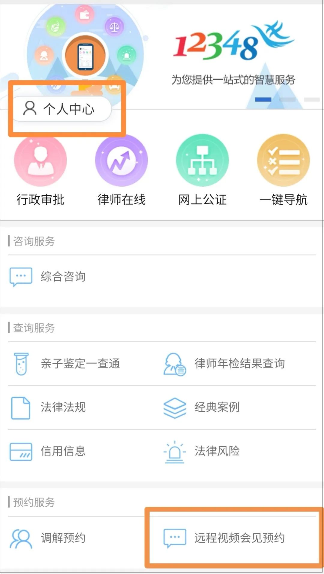 第二步:進(jìn)入公眾號(hào)后,點(diǎn)擊頁(yè)面底端“法律服務(wù)”,新用戶(hù)需要先點(diǎn)擊左上角的“個(gè)人中心”進(jìn)行注冊(cè)。注冊(cè)后,在法律服務(wù)頁(yè)面“預(yù)約服務(wù)”板塊點(diǎn)擊“遠(yuǎn)程視頻會(huì)見(jiàn)預(yù)約”。
