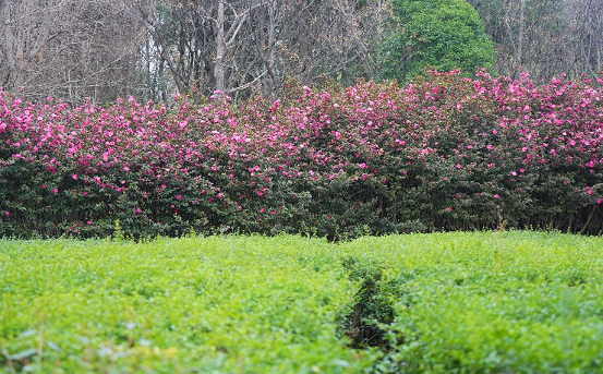 The camellias have also quietly bloomed, adding a touch of rich, gentle color to the season. Each camellia plant stands straight and tall, with layers of petals spreading out, becoming even more enchanting against the backdrop of green leaves.
