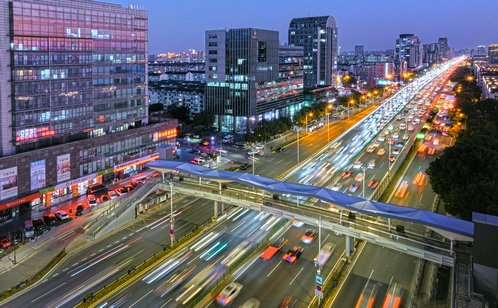 For the pedestrian bridge near Xinsu Building, the pavement and handrails have been renovated, and 18 flower boxes and a 2,120-square-meter canopy were added. Moreover, the lighting system consisting of hundreds of lamps along the stairs and other key parts make the bridge look charming at night.