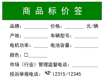 二、明碼標(biāo)價(jià),放心消費(fèi)。經(jīng)營(yíng)者應(yīng)當(dāng)以顯著方式進(jìn)行明碼標(biāo)價(jià),做到價(jià)簽價(jià)目齊全,標(biāo)價(jià)內(nèi)容真實(shí)準(zhǔn)確。價(jià)格標(biāo)簽或價(jià)目表等應(yīng)包括品牌價(jià)格、車輛型號(hào)、計(jì)價(jià)單位、產(chǎn)地、顏色、電機(jī)功率、投訴舉報(bào)電話等信息。價(jià)格標(biāo)簽和價(jià)目表推薦格式附后,供參考使用。